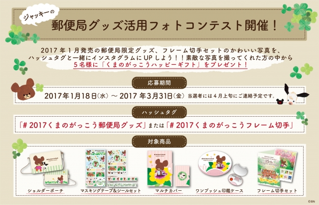 郵便局の「くまのがっこう」グッズ、フレーム切手セットが対象のフォトコンテストが1月18日からスタート。かわいい写真を撮った人に、「くまのがっこうハッピーギフト」をプレゼントする。 1月18日~3月31