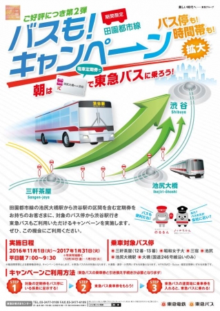 東京急行電鉄は、11月1日~2017年1月31日までの平日に、「バスも!」キャンペーン第2弾を実施する。 本キャンペーンは、田園都市線の池尻大橋~渋谷間を含む電車定期券を持つ利用者を対象に、国道246