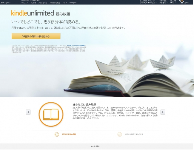 Amazonは、8月3日、「Kindle Unlimited」サービスを開始した。本サービスは月額980円(税込)で和書12万冊以上、洋書120万冊以上のKindle電子書籍が読み放題になる、新しい定