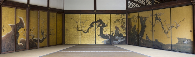 京都文化協会とキヤノンが共同で取り組む「綴プロジェクト」(正式名称:文化財未来継承プロジェクト)は、2012年から天球院「方丈障壁画」のうち金碧画(きんぺきが)56面の高精細複製品を制作してきた。今回