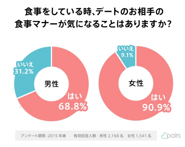 エウレカが運営する恋愛・婚活マッチングサービス「pairs(ペアーズ)」 http://www.pairs.lv/ は、「デートの食事マナー」についてアンケート調査を実施した。調査対象は「pairs」