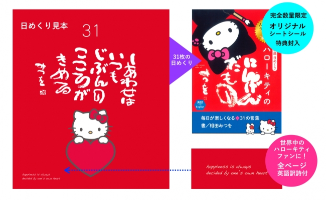 ダイヤモンド社は、相田みつを美術館と協力し、日めくり「幸運日めくり ハローキティのにんげんだもの ~毎日が楽しくなる31の言葉~」を発売した。 この日めくりは、家庭や職場、学校などさまざまな場所でがん