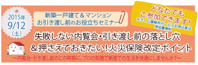 個人向け不動産コンサルティング・ホームインスペクションを行うさくら事務所では、新築マンション・一戸建ての内覧会を控えた人向けの、一般向けセミナーを開催する。 9月から年末にかけては、新築一戸建て・新築