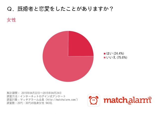 婚活アプリ「マッチアラーム」を運営・開発するマッチアラームは、20代、30代の独身男女2,965名を対象に、恋愛、婚活に関するインターネット調査を実施、結果を公表した。 「既婚者と恋愛をしたことがあり