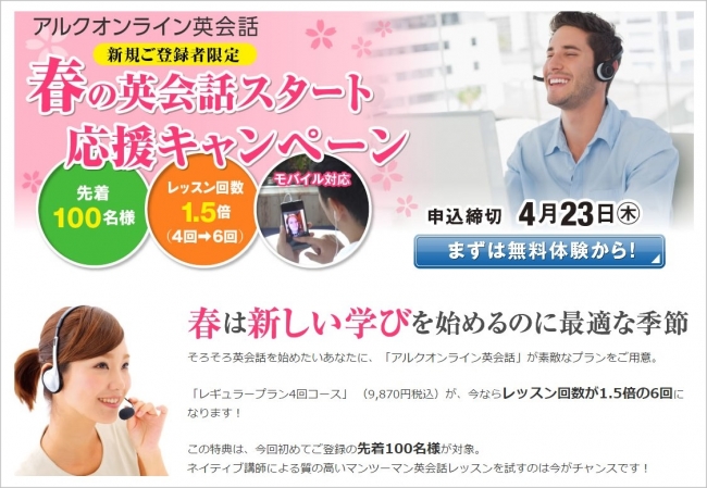 アルクは、オンライン英会話の新規申込者向けに、レギュラープランのレッスン回数を増量するキャンペーンを、期間限定で実施する。 「アルクオンライン英会話」は、インターネットがつながるところなら24時間いつ