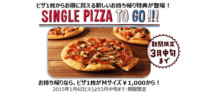 日本で最初のデリバリーピザチェーンドミノ・ピザは、1月6日より3月中旬までの期間限定でピザ1枚からお得に買えるキャンペーン「SINGLE PIZZA TO GO!!!(シングル ピザ トゥ ゴー)」を